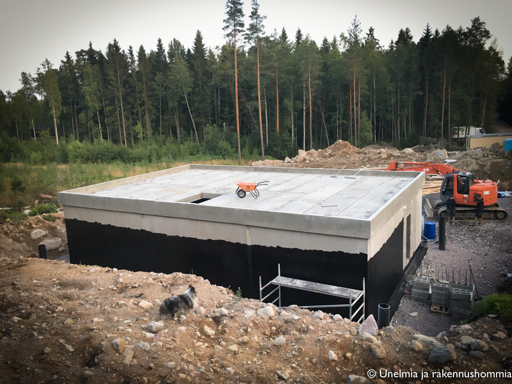 Nyt alkaa kellari olla siinä vaiheessa, että nyt viikonlopun aikana tehdään kellarille vedeneristys. Meillä on rinnetontti ja toisella sivulla siis voimakas maapaine. Kellari tullaan eristämään ulkopuolelta bitumikermillä, sen päälle lämmöneristelevyt sekä patolevyt viimeisenä. Sen lisäksi kapillaarikatko, pintamaan kallistukset, oikea maa-aines sekä toimiva salaojajärjestelmä takaa että vesi ajautuu pois talon ja kellarin seinäpinnoilta.